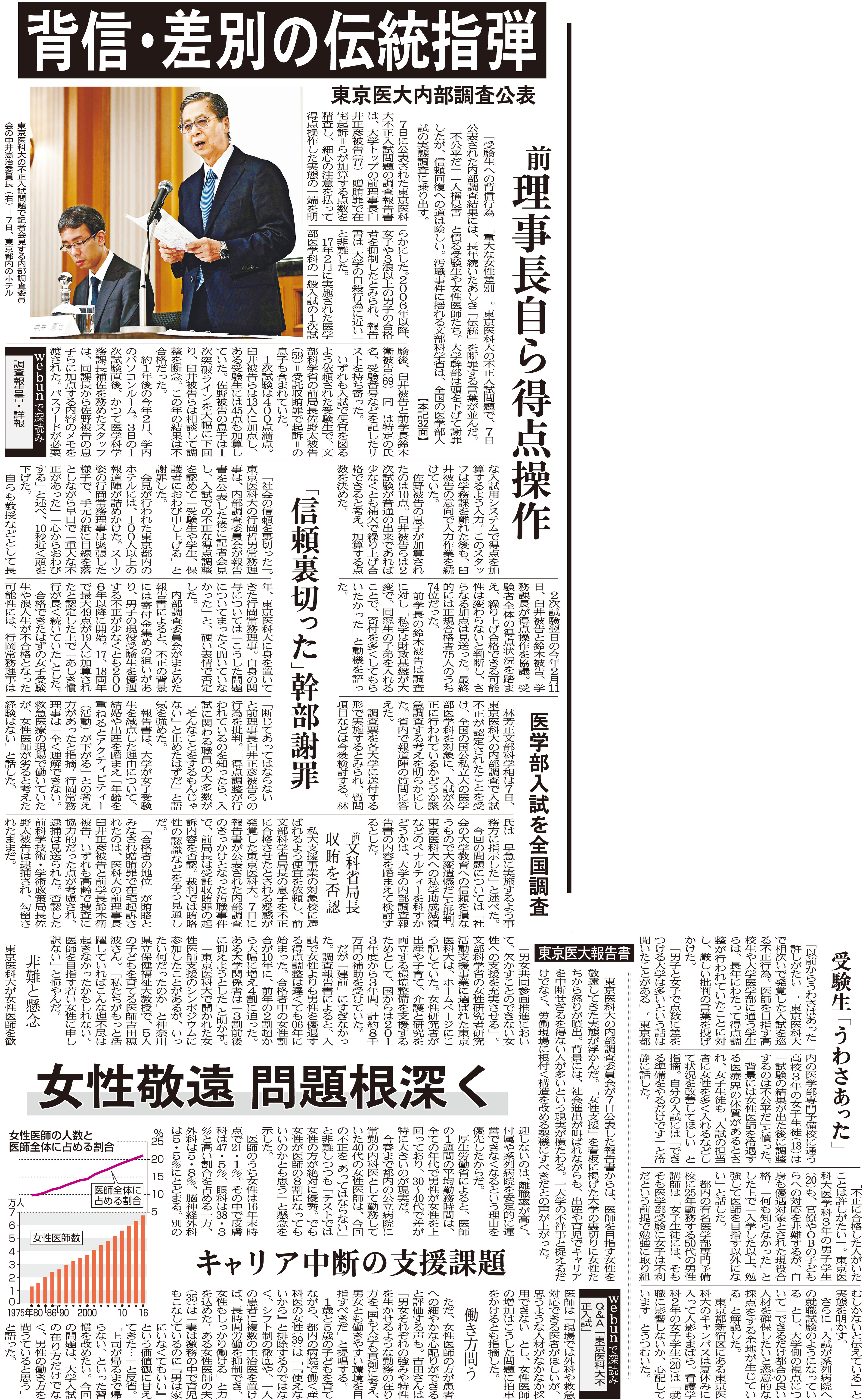 逆に女性や四浪以上だということで、差別され減点された人。自分の夢をかなえる第一歩である学ぶ機会さえもうばわれてしまった。努力しても変えられない性別。あきらめずに挑んだ受験。それが初めから点数を下げられていたとしたら。夢を押しつぶされたむなしさと悲しさがこみあげてくるだろう。得点調整を指示した大学トップの罪は日本の将来を担う若者に対しても、今、現場で働く医師に対しても大変大きい。