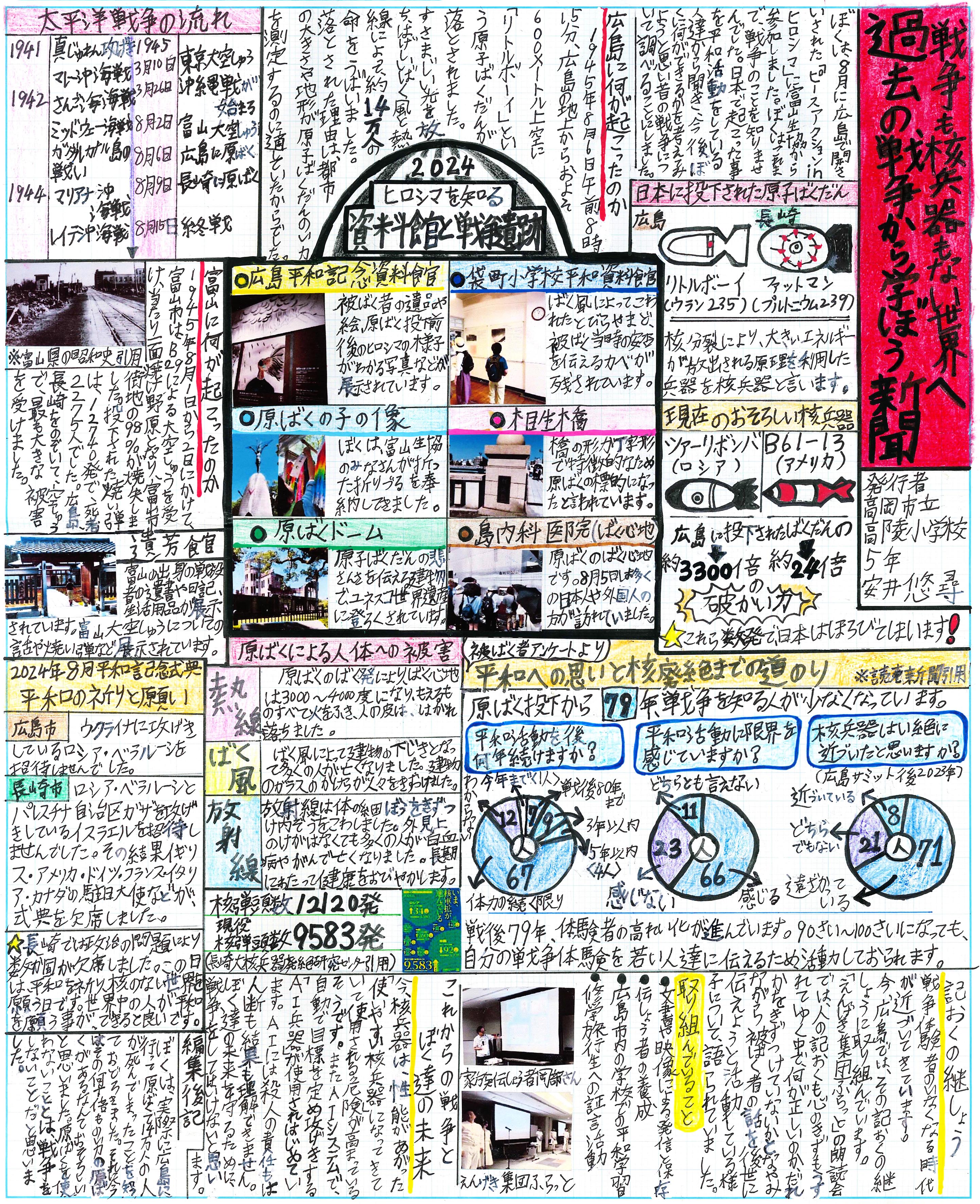 先日、日本原水爆被害者団体協議会がノーベル平和賞を受賞した。この団体は、被爆者という立場から核兵器の廃絶を訴える活動を続けてきた。しかし、被爆者、戦争を体験した人々は年々減少しており、近い将来には必ずゼロになってしまうのだ。唯一の被爆国であったとしても、その記憶を繋がないことには、世界平和を訴えることはできない。来年は終戦80年という節目の年である。この機会に、テレビや新聞で戦争について知見を深め、平和について思いを巡らせてほしい。