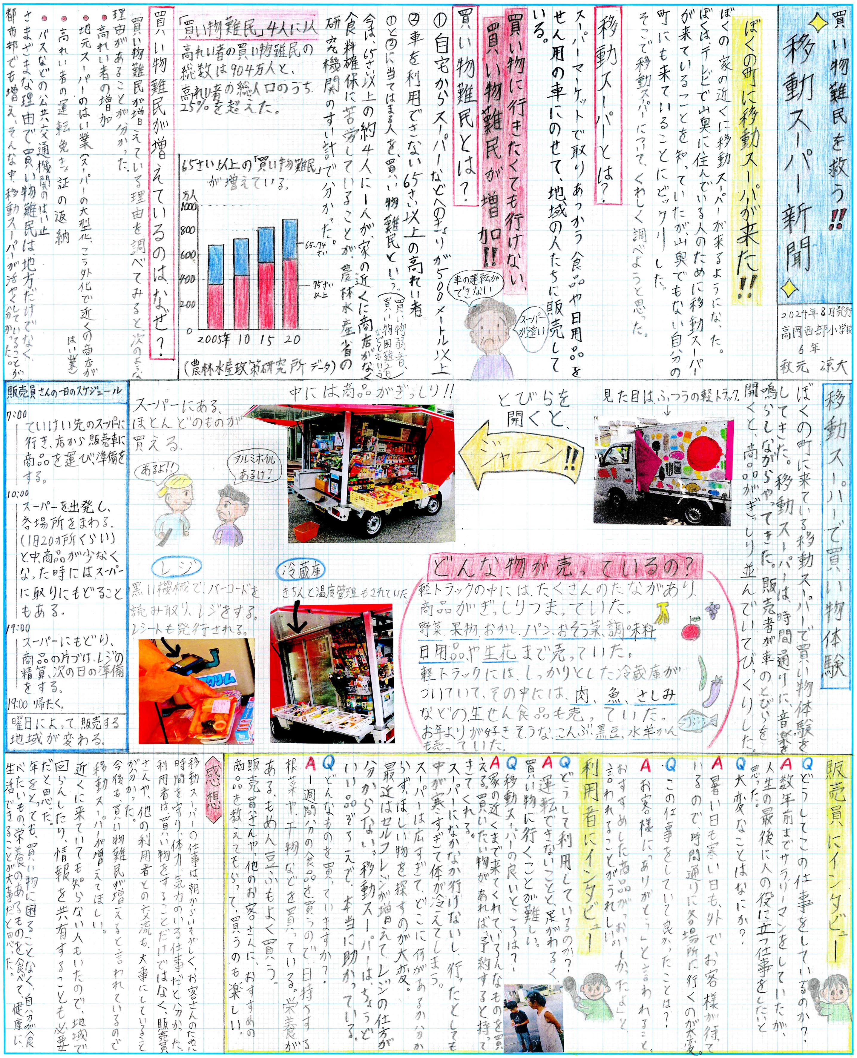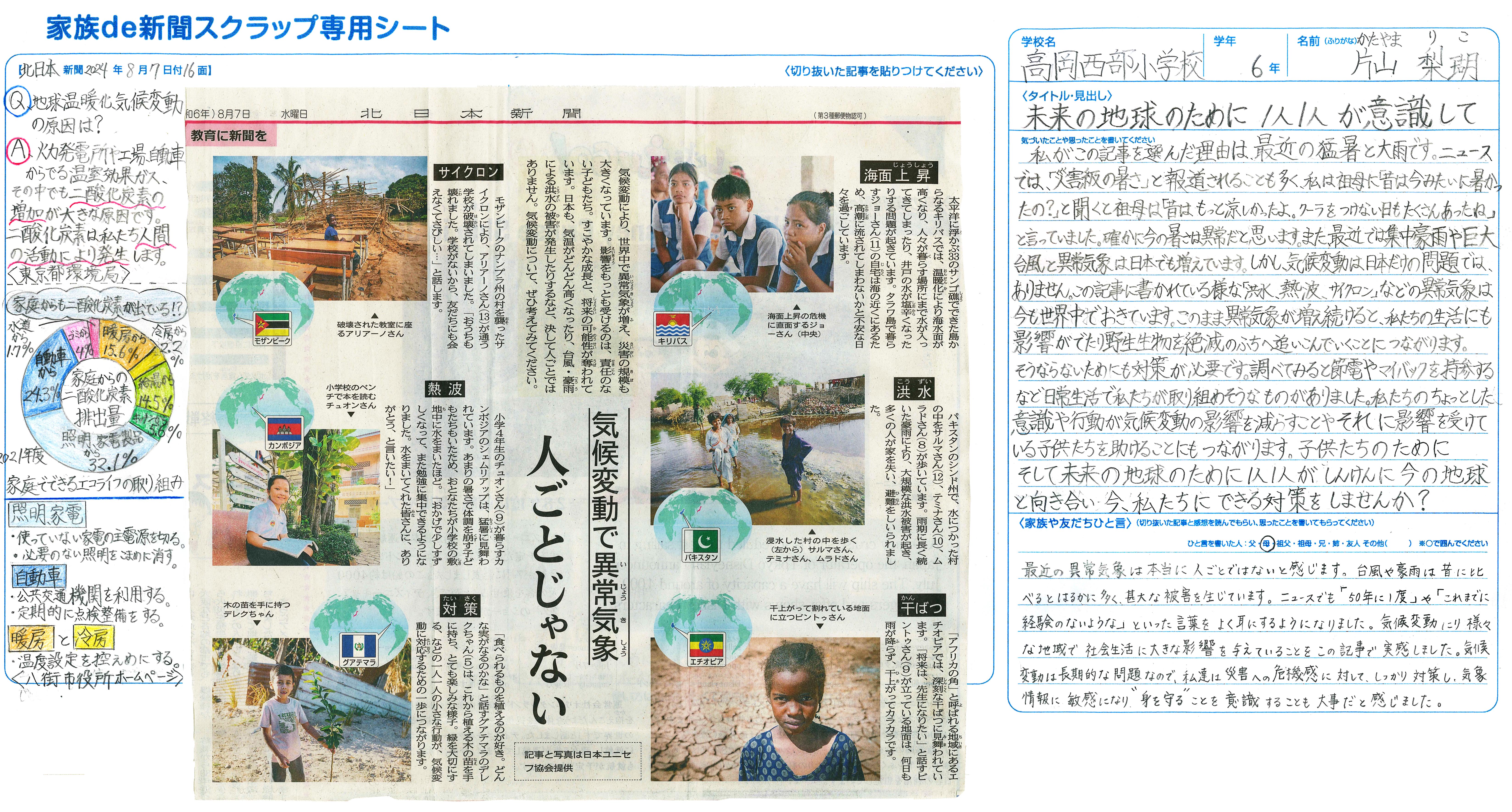 テーマを決めて調べ、取材したことを新聞の形で発表する「かべ新聞」に217点、気になる記事を切り抜いて家族や友人と意見をまとめる「家族de新聞スクラップ」に2,340点、記事を読んだ感想や新聞について思うことをつづる「新聞感想文」に1,706点の計4,263点が寄せられました。