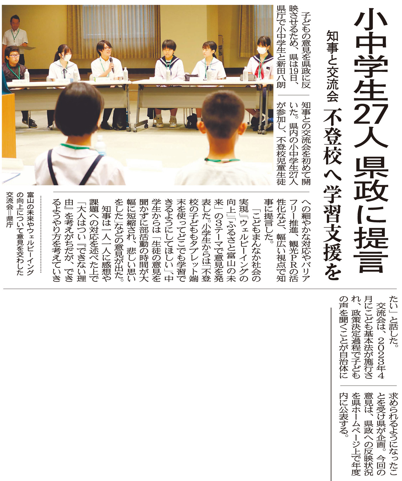 夏休みに、県庁で行われた「こども意見表明交流会」に参加した。未来を担う小学生と中学生が知事と意見を交わし、より良い富山県にしていくための取り組みである。これは、富山県が今年初めて開催したものだ。事前に県から三つのテーマが提示され、それについて、自分の意見をまとめて提出する。その後県から指示のあったテーマについて当日交流会で意見を述べる、というものだった。
