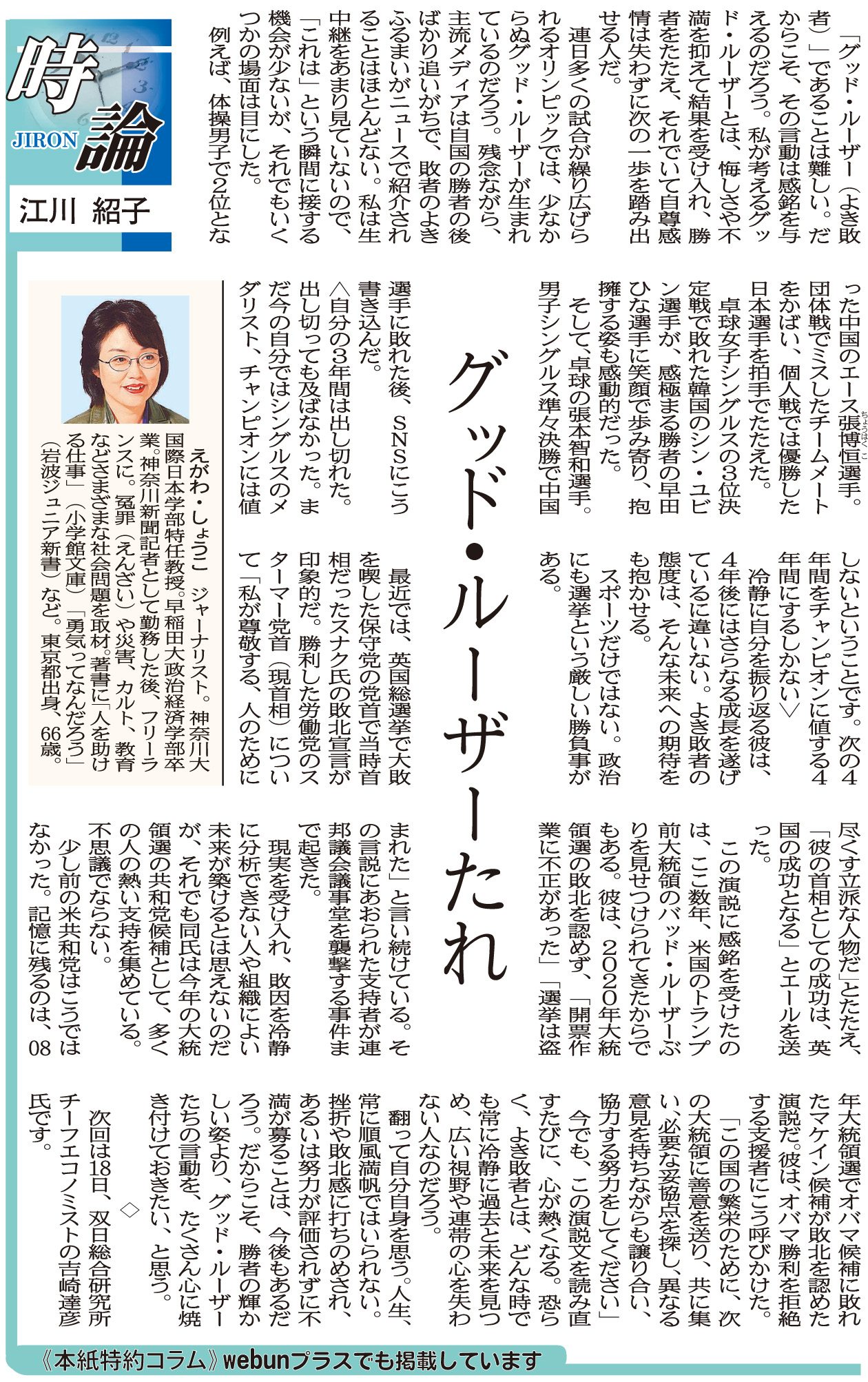 記事には、オリンピックの体操男子で銀メダルに終わった中国の張博恒選手が、個人戦で優勝した日本選手を拍手で称えたことや、卓球女子シングルスの三位決定戦で敗れた韓国代表のシン・ユビン選手が感極まる勝者の早田ひな選手に笑顔で近づき抱擁する姿などを例にあげ、「グッド・ルーザー」とは、悔しさや不満を抑えて結果を受け入れ、勝者を称え、それでいて自尊感情は失わずに次の一歩を踏み出せる人だと定義していた。勝負の世界で、「グッド・ルーザー」になるのは難しい。だからこそ、その言動には、勝者と同じような強さと感動があるのだと思う。
