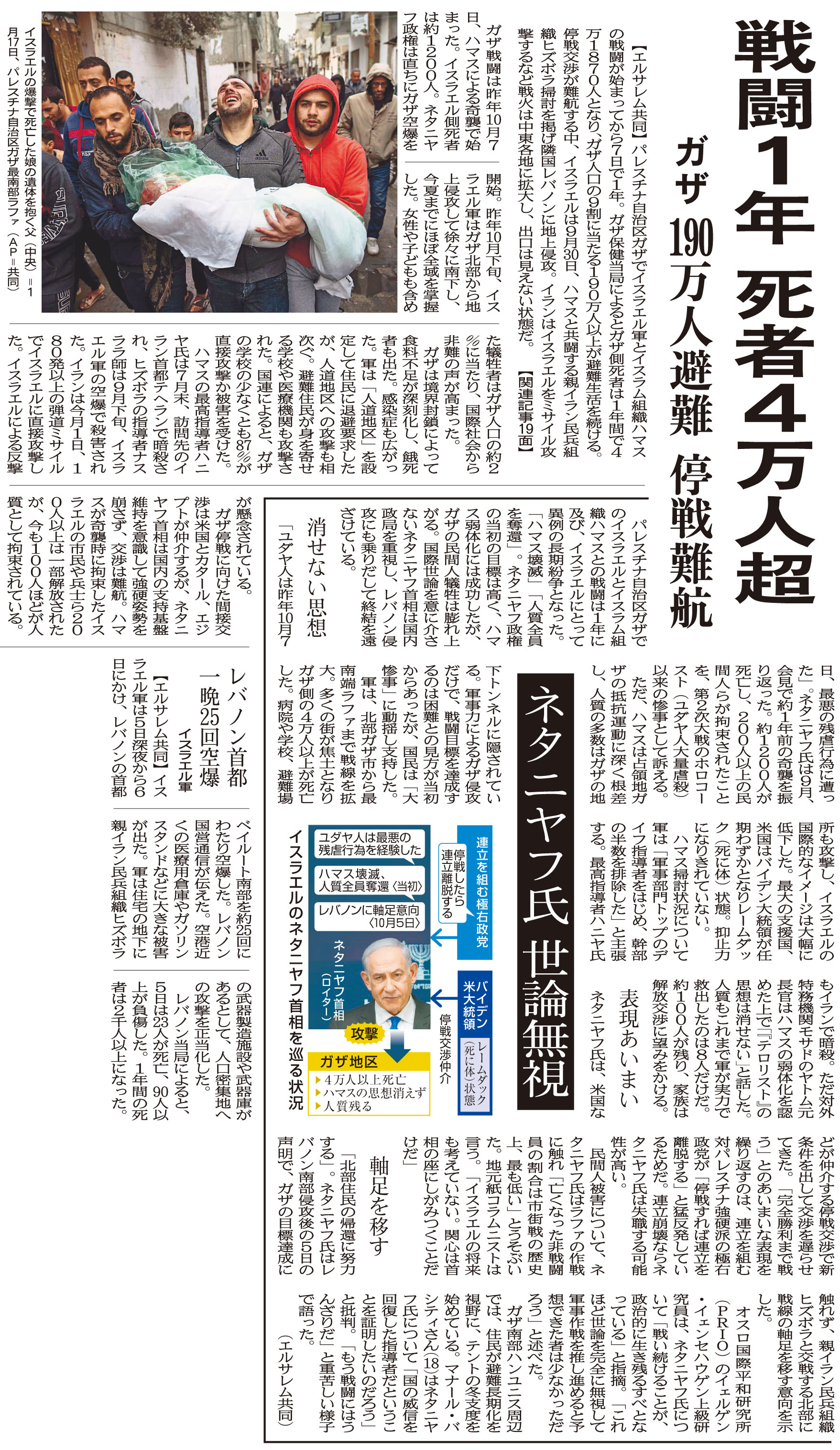 いつになったら争いのない、平和な世界になるのか。まったく答えの見えない疑問が、頭の中にふっと浮かぶ。「戦闘1年 死者4万人超」と大きく書かれた見出し。パレスチナ自治区のガザ地区で続く、イスラエル軍とイスラム組織ハマスの戦闘を報じる記事だ。開戦の背景、双方の被害や他国との関わり、そしてイスラエルのネタニヤフ首相についての話題と記事は続いていく。なぜ戦争が起きるのか。この単純で複雑な問いが、私を、いや、世界中の人々の頭を悩ませている。