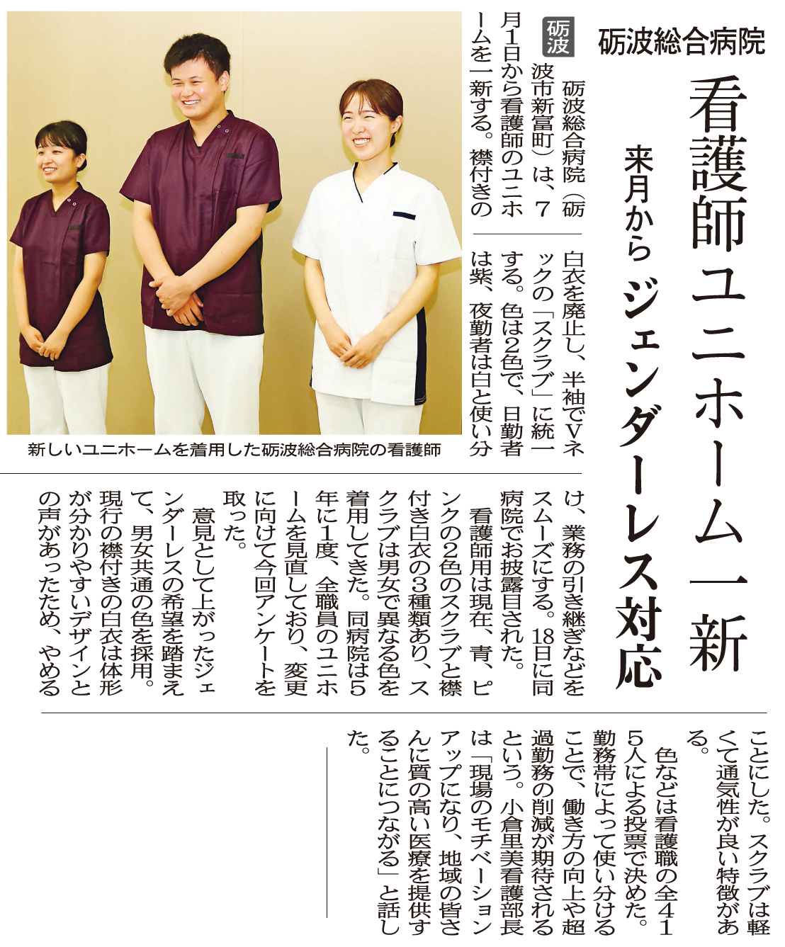 先日、砺波総合病院の看護師のユニフォームが変更されるという記事を読んだ。従来は白衣、男性が着用する青のスクラブ、女性が着用するピンクのスクラブの三種類があったそうだ。しかし、白衣は体形が分かりやすいという理由から廃止され、スクラブはジェンダーレスの希望から男女共通の色が採用された。スクラブの色は二色あり、日勤者と夜勤者で使い分けるとのことだ。このような取り組みは、現代社会における多様性の尊重や職場環境の改善に向けた重要な一歩だと感じた。