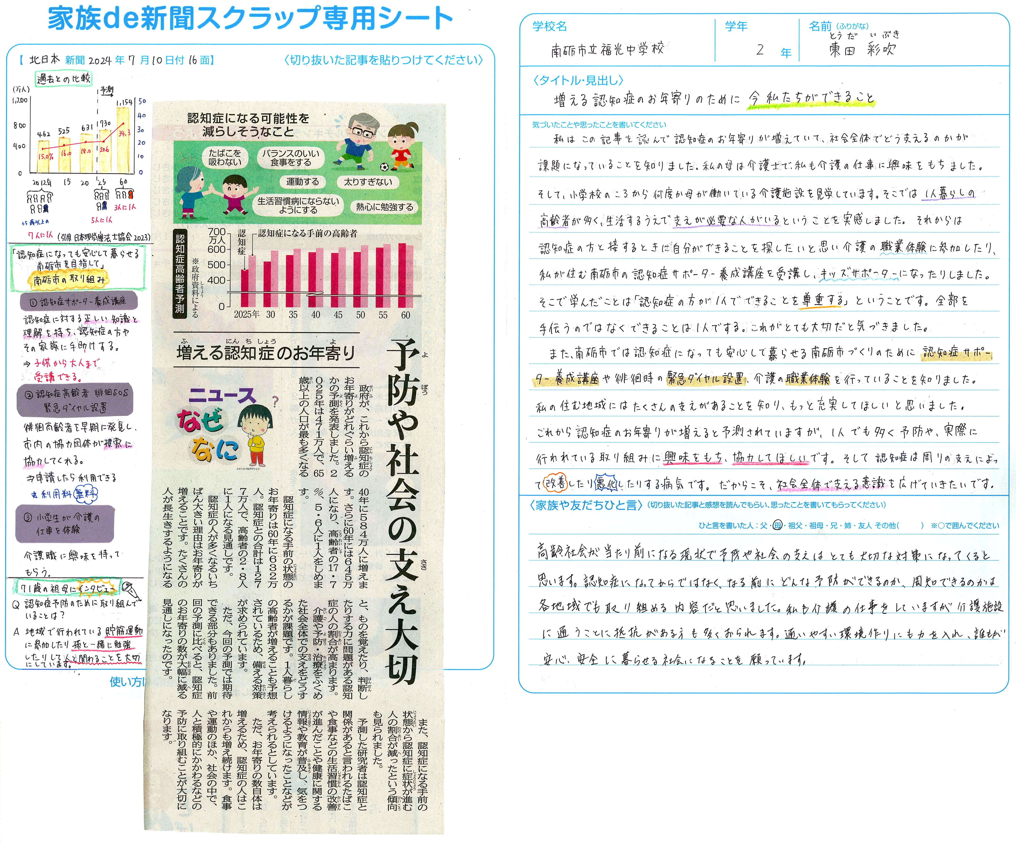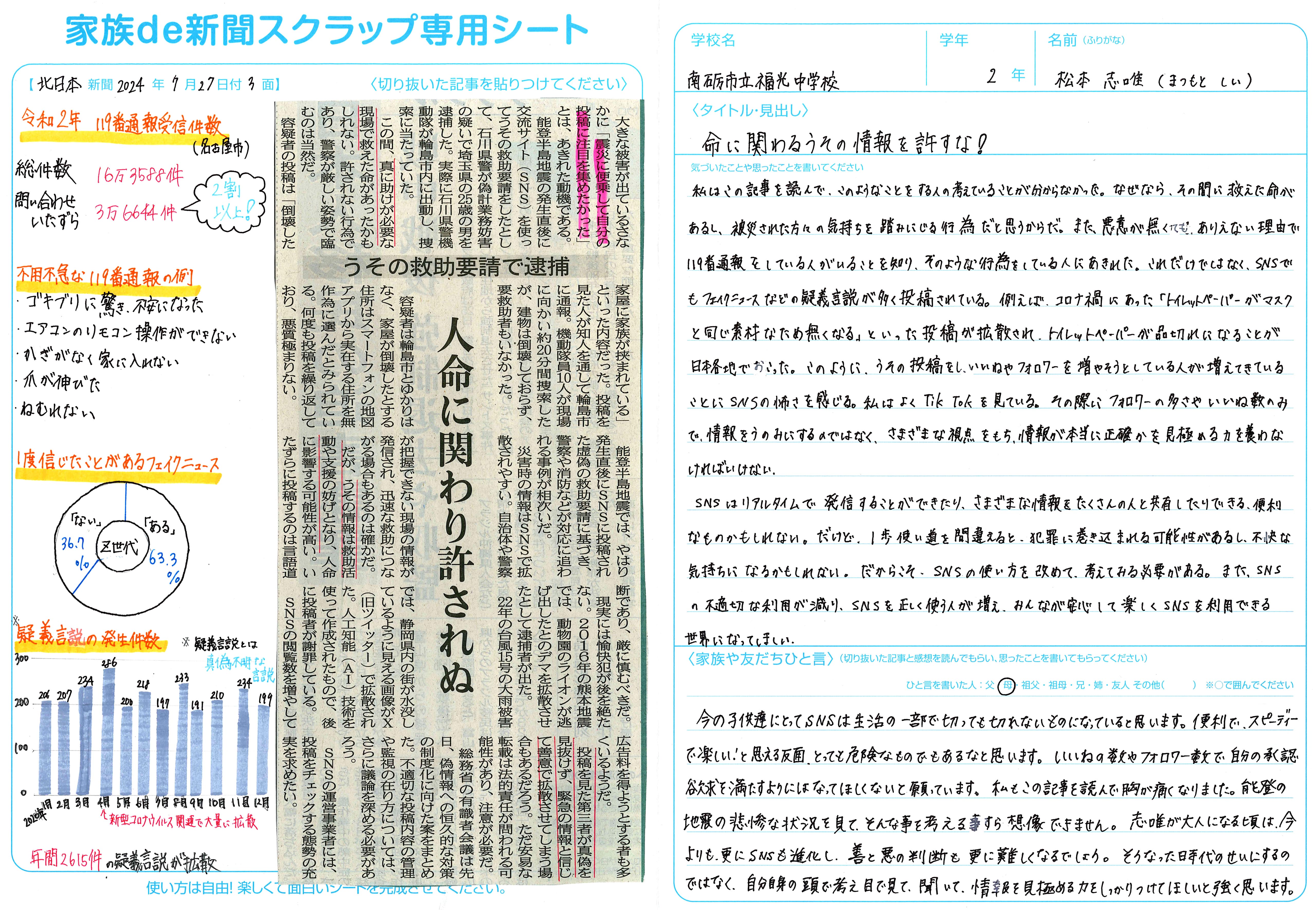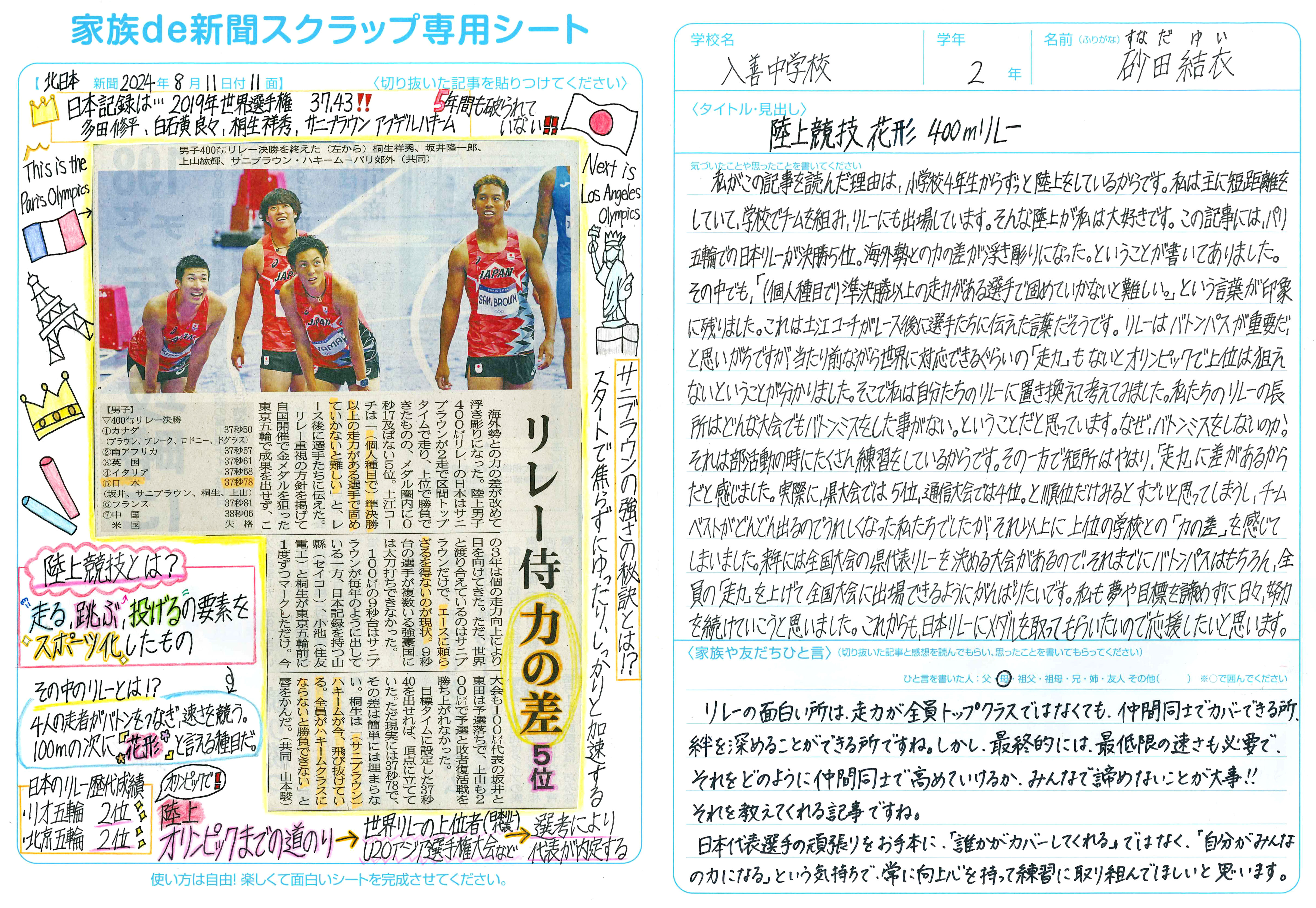 新聞記事は情報を得るだけでなく、自身の経験を反すうしたり生き方を考えたりすることで、自身が変わるきっかけとなることもあると思います。今後も新聞を通していろいろな世界に接し、傍観するのではなく、自分に働きかけ、自分の考えを発信してくれることを期待しています。