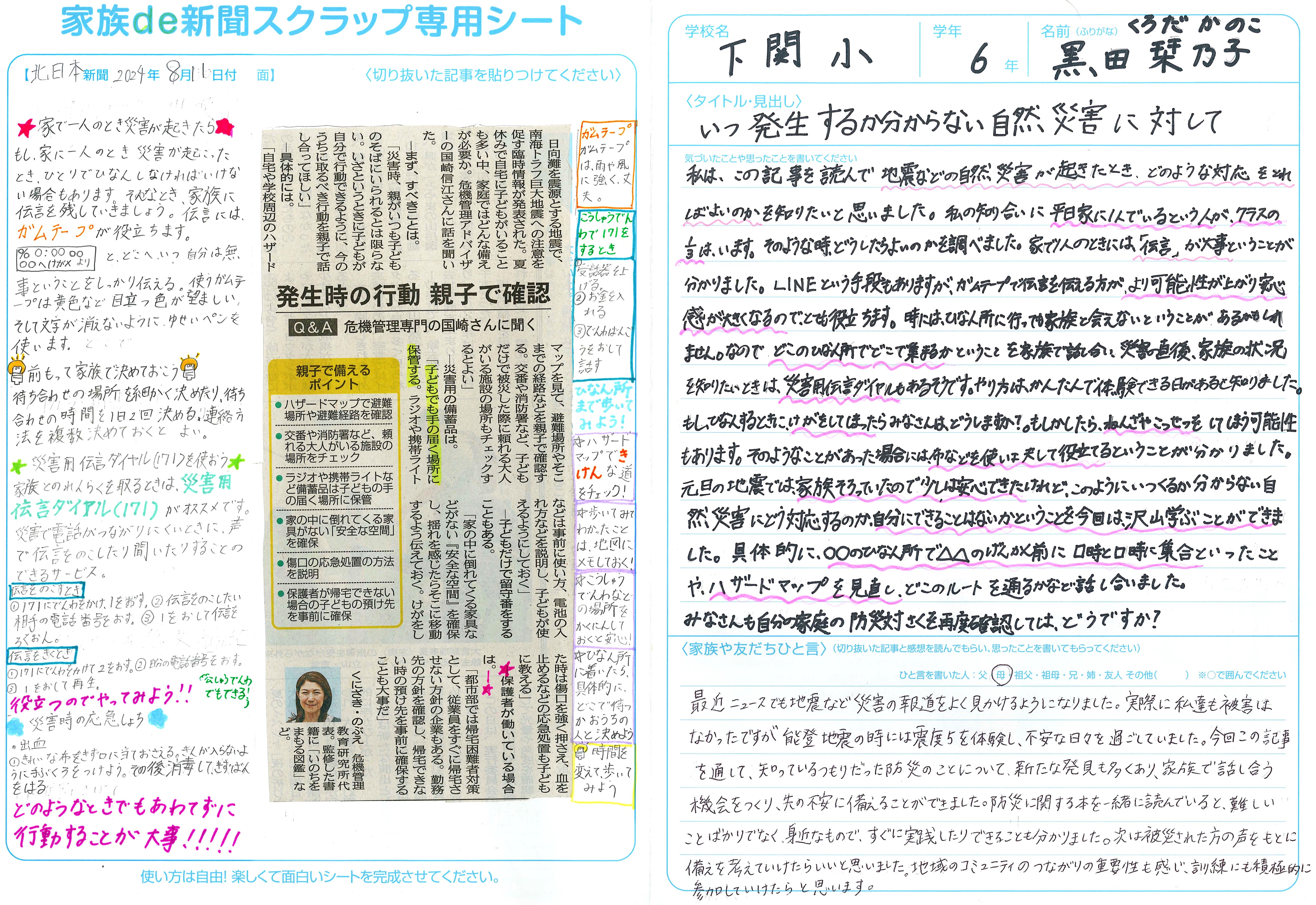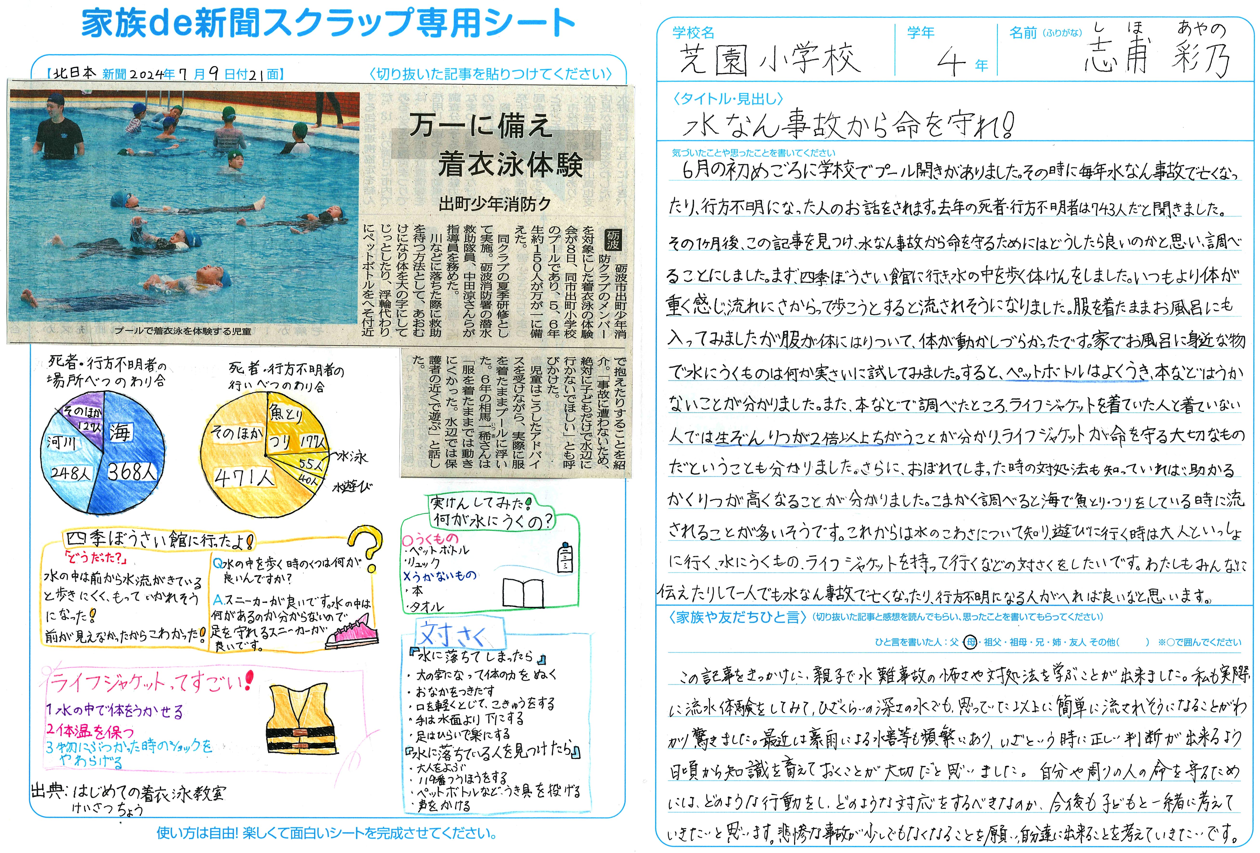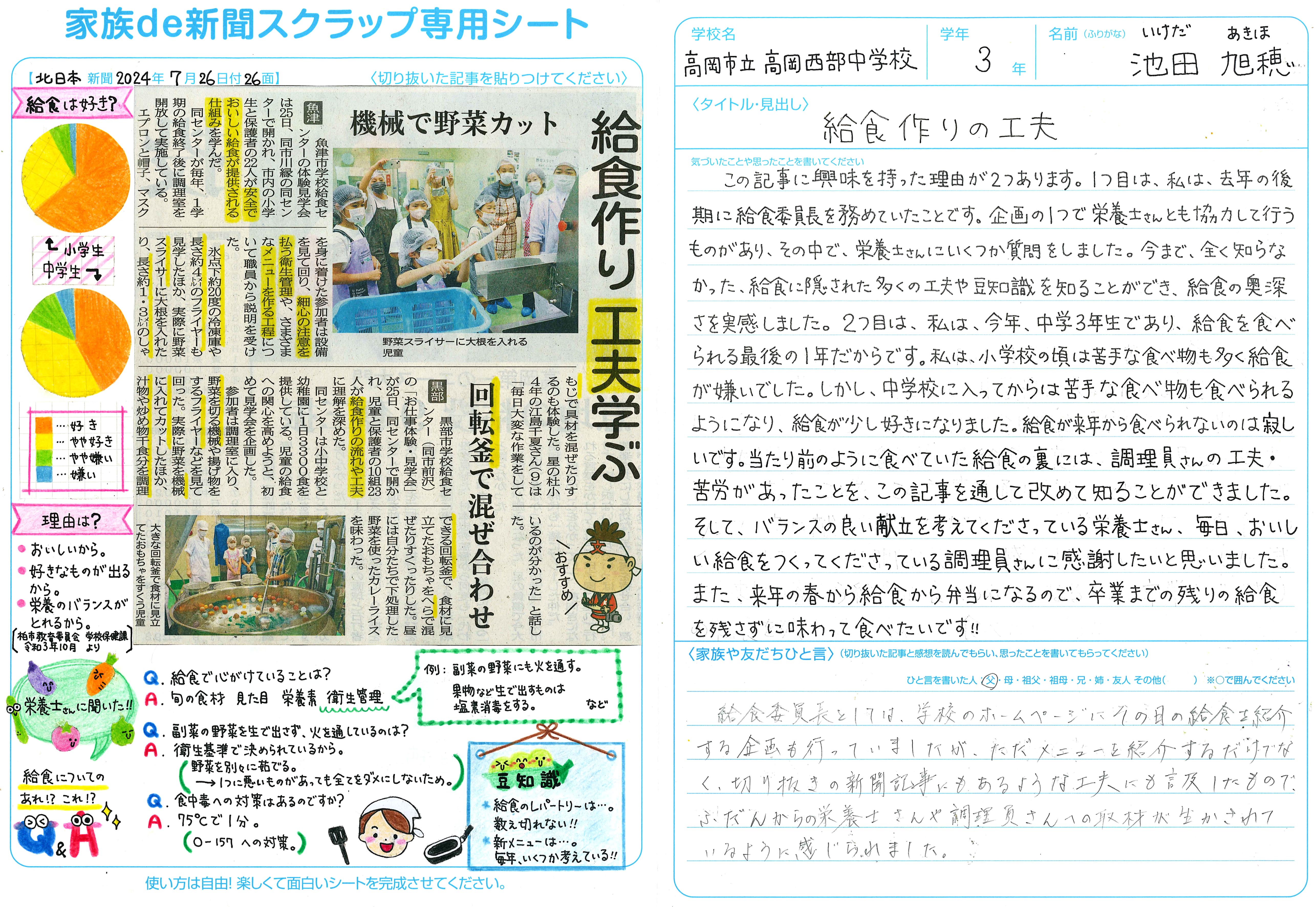 新聞記事は情報を得るだけでなく、自身の経験を反すうしたり生き方を考えたりすることで、自身が変わるきっかけとなることもあると思います。今後も新聞を通していろいろな世界に接し、傍観するのではなく、自分に働きかけ、自分の考えを発信してくれることを期待しています。