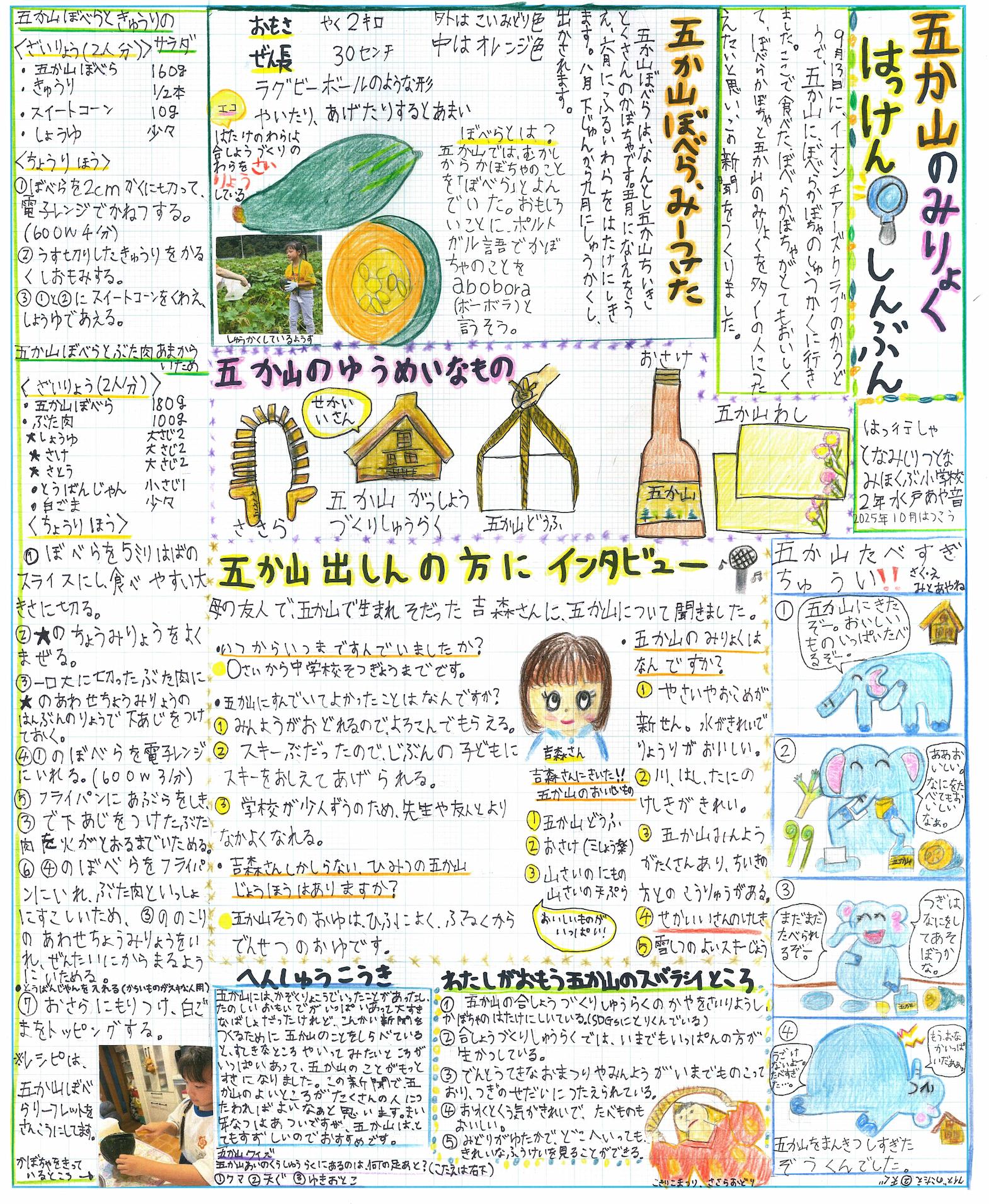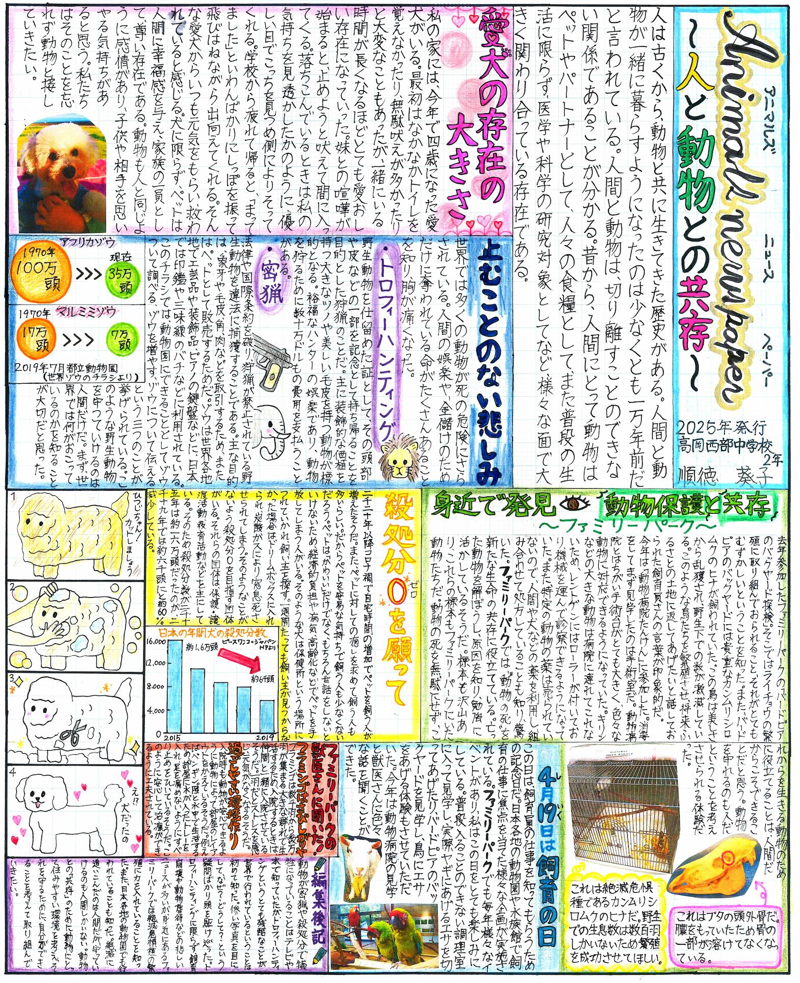 みなさんの作品をみると、記事を通して身の回りの出来事を新鮮な目で見返し、自ら問題を発見したり、実際に取材・体験を通して解決したりしながら、丁寧にまとめてあると感じました。また、いろいろな意見や知恵に触れることを通して、問題を理解し、判断していこうとする姿に感心しました。