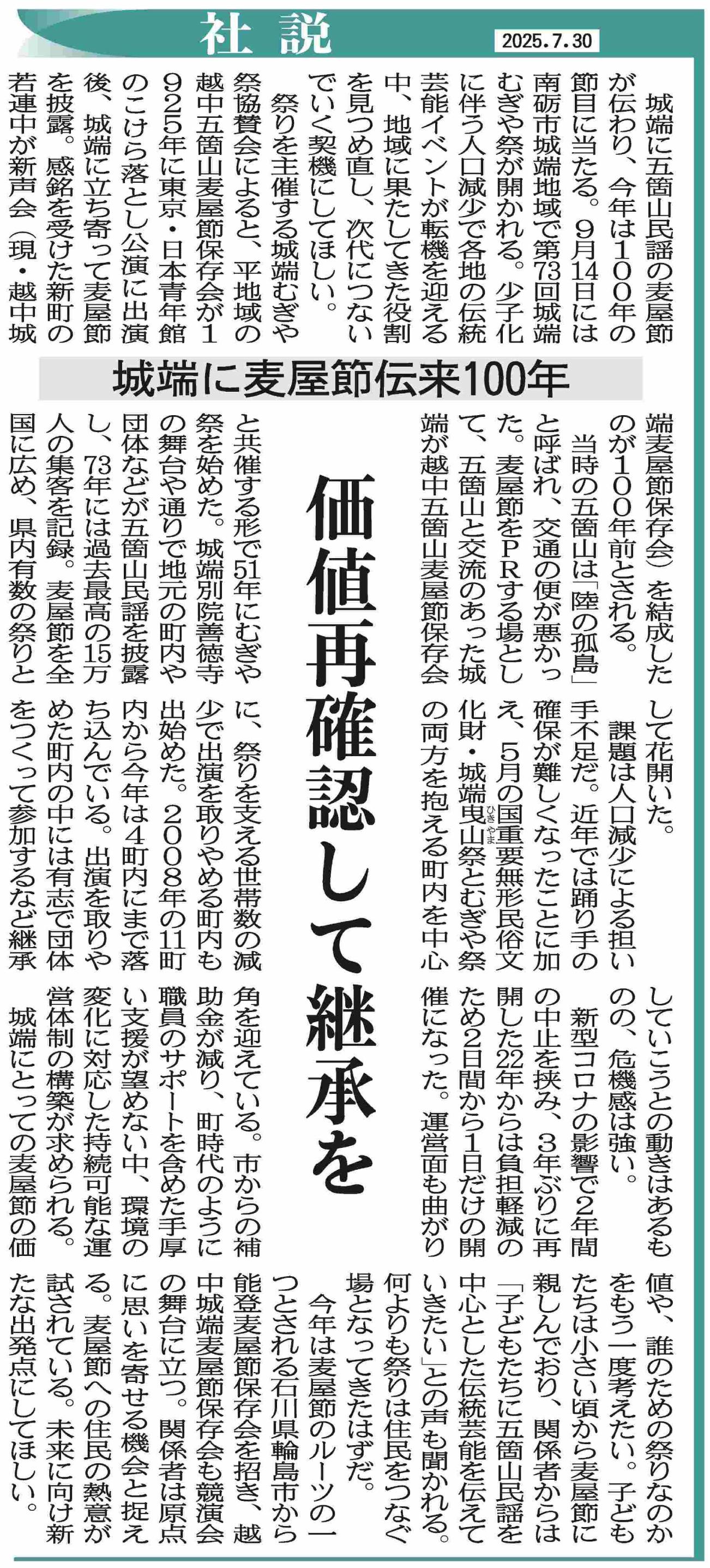 ある日、そんな私の目に、「麦屋節伝来百年」という文字が飛び込んできた。富山県南砺市城端地域の伝統的な民謡である「麦屋節」の伝来から百年が経ったことが取り上げられており、地域の伝統芸能の役割を見つめ直し、未来へ継承していくことの大切さを考えさせられる記事だった。