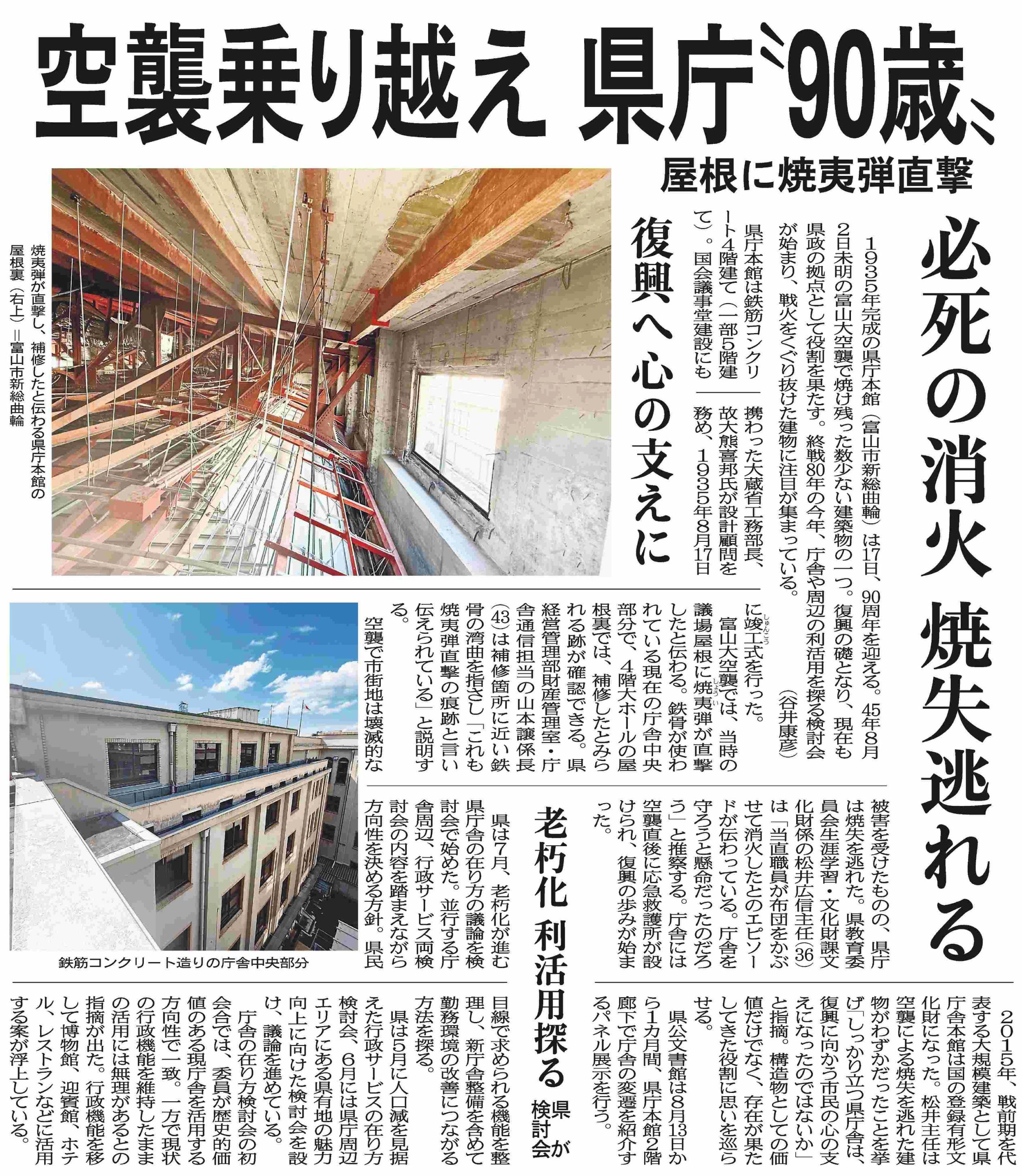 富山大空襲についてもっと知りたいと思っていると、空襲を受けた県庁の記事が載っていました。県庁の本館は当時、議場屋根に焼夷弾が直撃しましたが、現在も県政の拠点としての役割を果たしています。私は、県庁が今、どういった形で残っているのかが気になり、実際に見に行きました。空襲から八十年経っているということもあり、今は補修され、とても立派な建物でした。これが「市民の心の支え」という県教育委員会の松井さんの言葉の意味がよく分かりました。