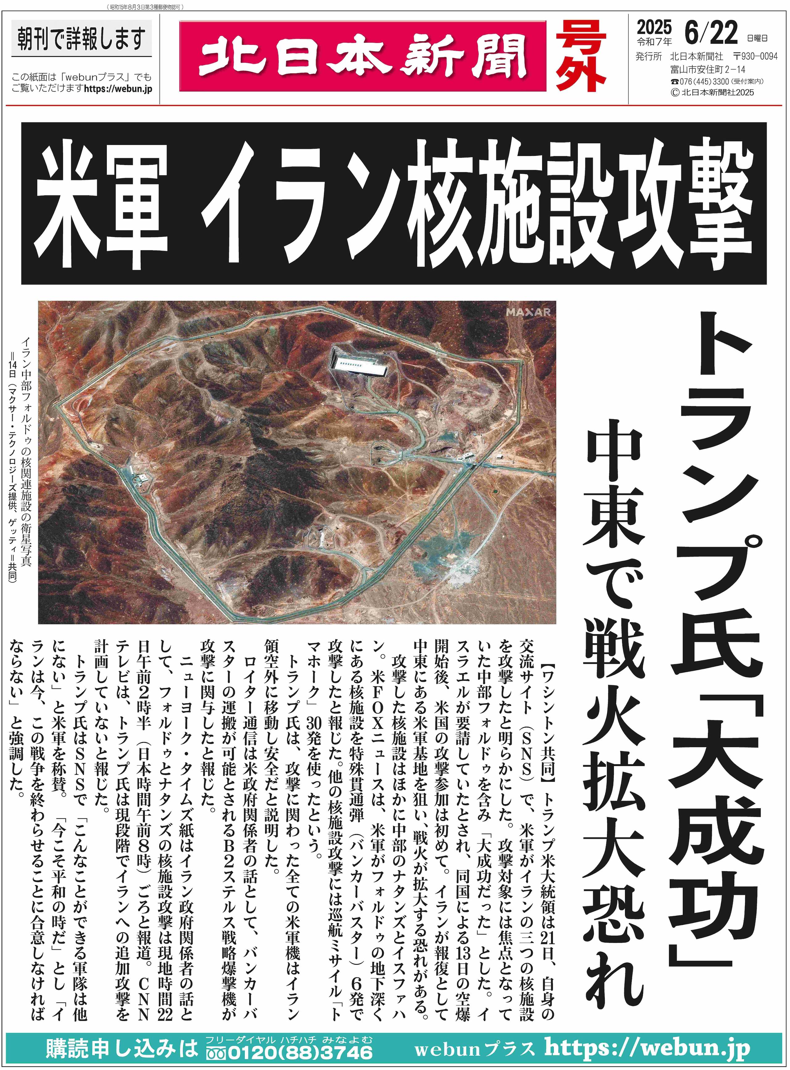 号外の見出しで躍るトランプ氏「大成功」という言葉を見て、私は静かな痛みを覚えた。国の長として兵士の士気を高める重要性は理解できる。しかし、命が奪われ、緊張が高まる現実を前に、それを「成功」と煽ることに深い危機感を覚える。挑発的な言葉が常に新たな火種を生み、事態を悪化させてきたことは歴史が証明しているからだ。