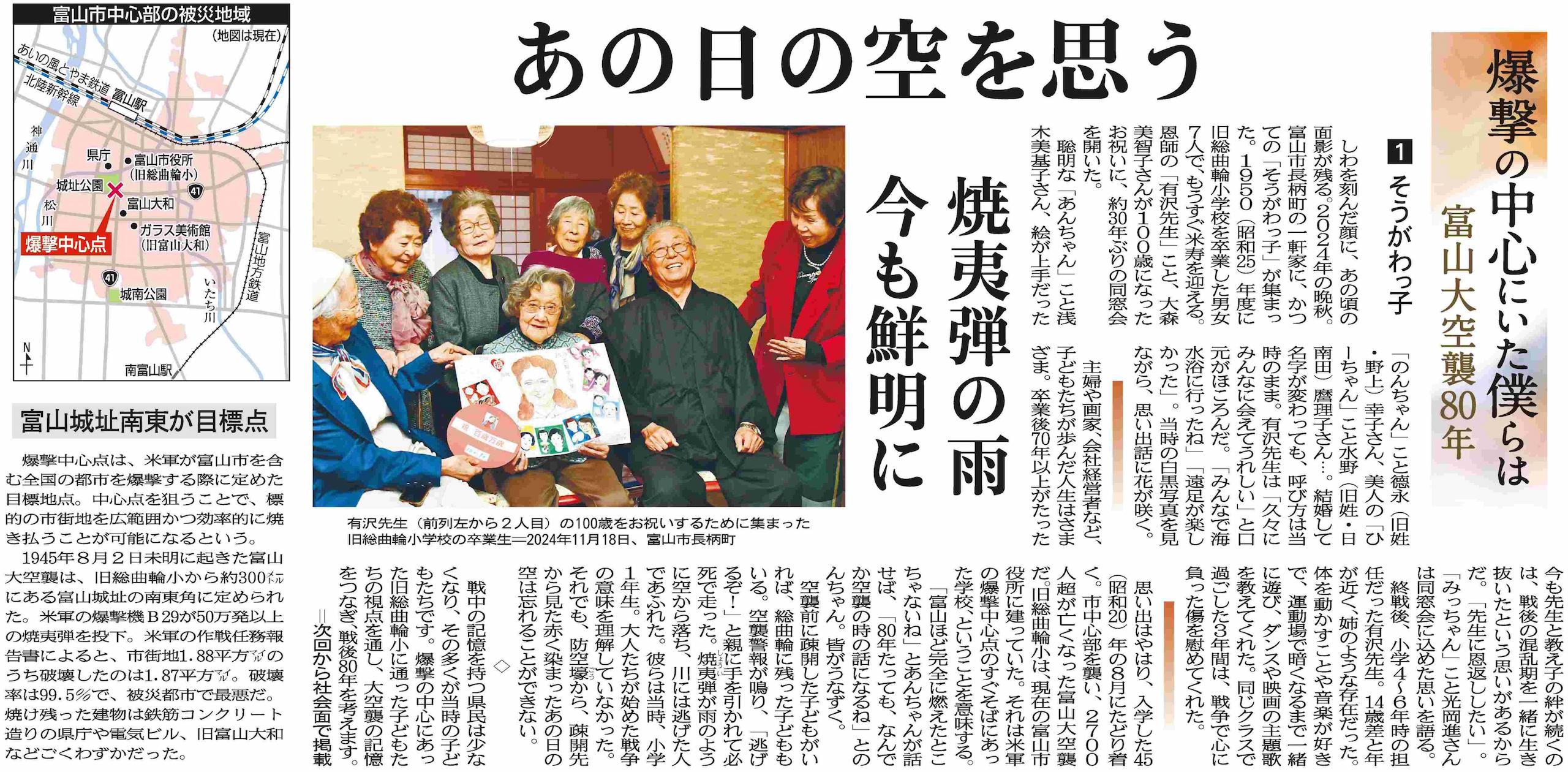 私は、八月一日に、富山市で行われた北日本新聞納涼花火を見に行きました。とても色鮮やかな花火が空いっぱいに広がり、とても感動しました。次の日の新聞を見ていると、毎年行われているこの花火の意味が書かれていました。それは、一九四五年八月二日にあった富山大空襲の犠牲者への鎮魂の思いと、平和への願いでした。