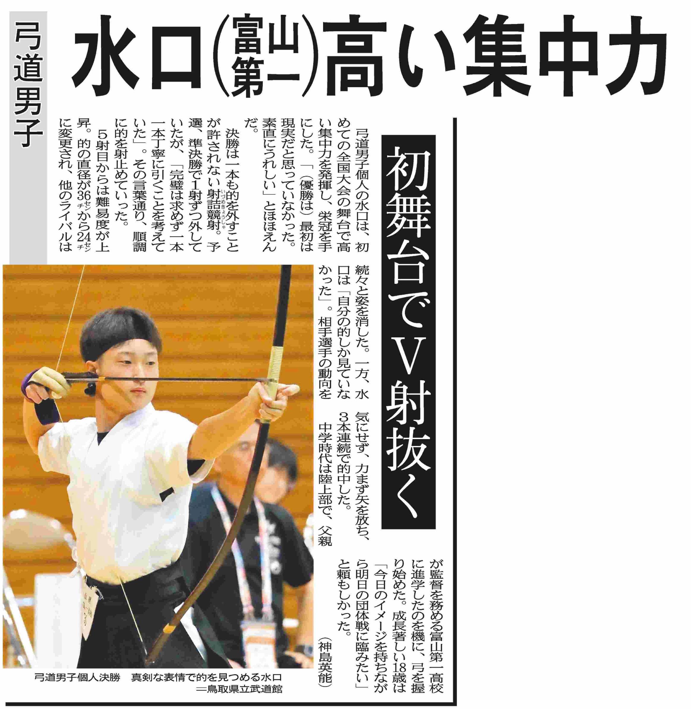 中学校最後の全国大会、一緒に努力してきた三年生の仲間たちとやっと全員で夢の舞台に立てるという嬉しさと、楽しみだという気持ちがある反面、昨年の結果から少し不安な気持ちもある。そんな時にこの記事に出合った。ちょうど今の私にぴったりな記事だと思った。それは、富山第一高校に進学して弓道を始め、全国大会個人戦で優勝した水口選手の記事だった。この記事から私は、たくさんの学びを得た。