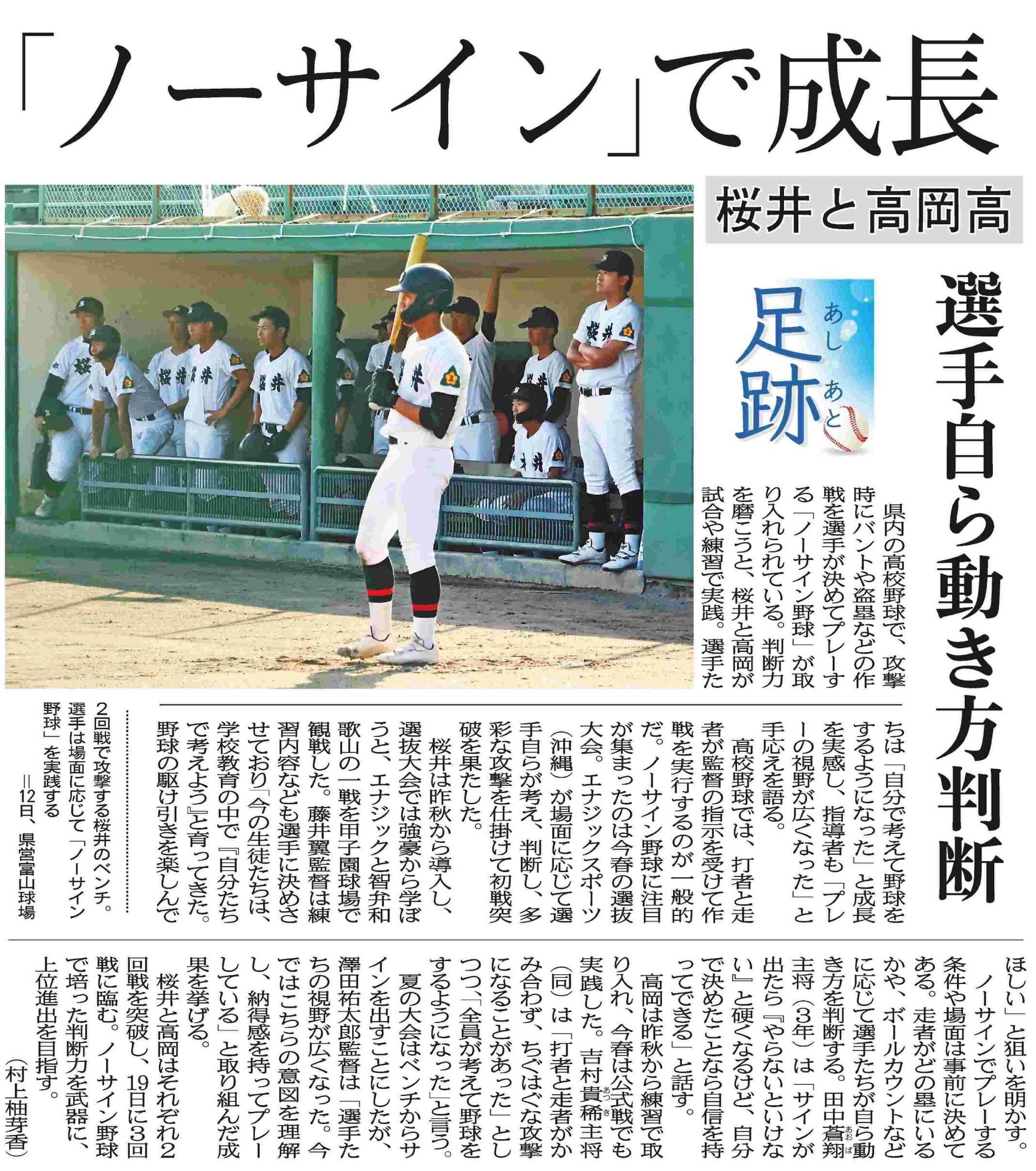 夏になると高校野球についての報道が新聞やテレビで連日あります。日焼けした高校生が勝って喜び合う姿、負けて悔し涙で下を向く姿を毎年見かけます。私は野球についてはよくわかりませんが、高校生の夏の大会は気になります。新聞で県内の高校野球で取り入れられている「ノーサイン野球」についての記事が目にとまりました。選手自ら動き判断する野球はどういうことか気になりました。