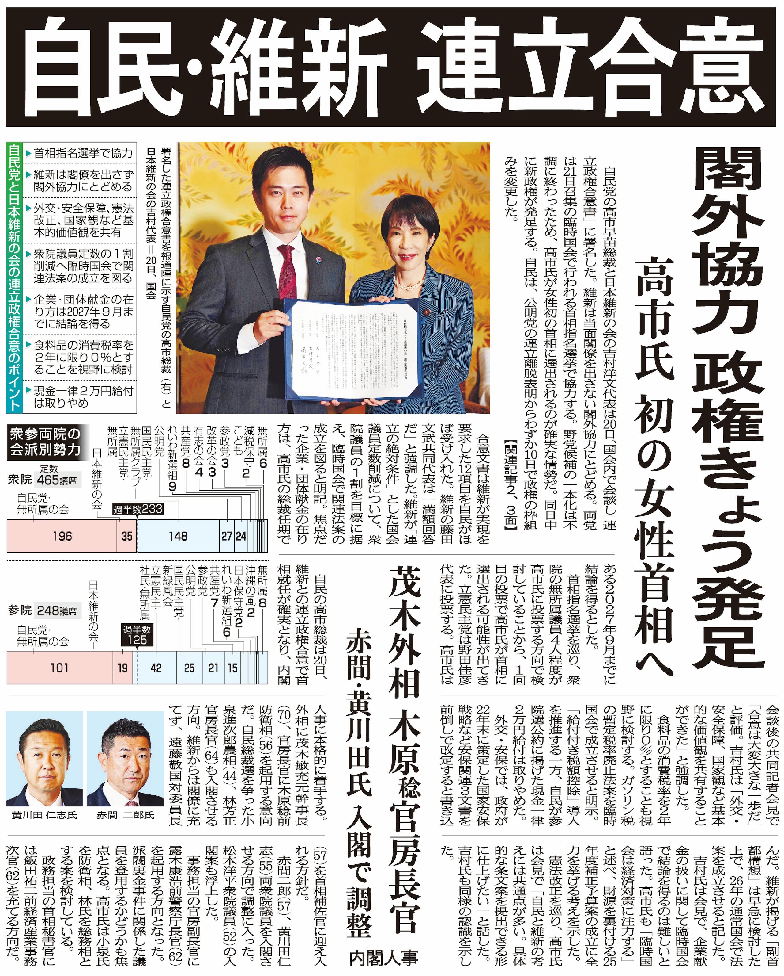 十月二十一日の北日本新聞に載った「自民・維新 連立合意」という記事を読んでみることにした。読み終えたとき、「政治が大きく動き出したな」と感じた。最近の政治はいつもどこか落ち着きがない。まるで風の中揺れる木のように、支え合いながらも、ぶつかり合い、バランスを探しているようだ。