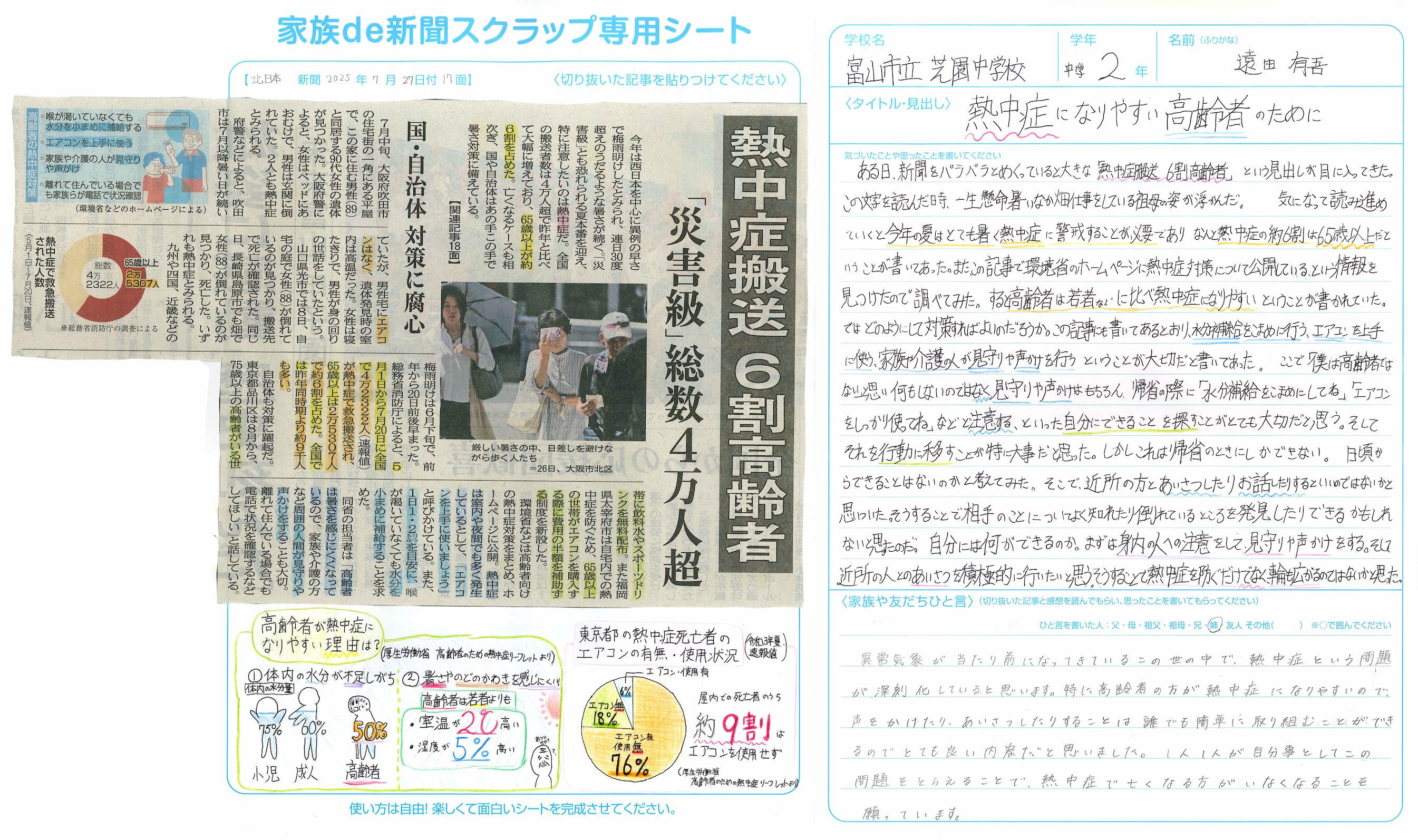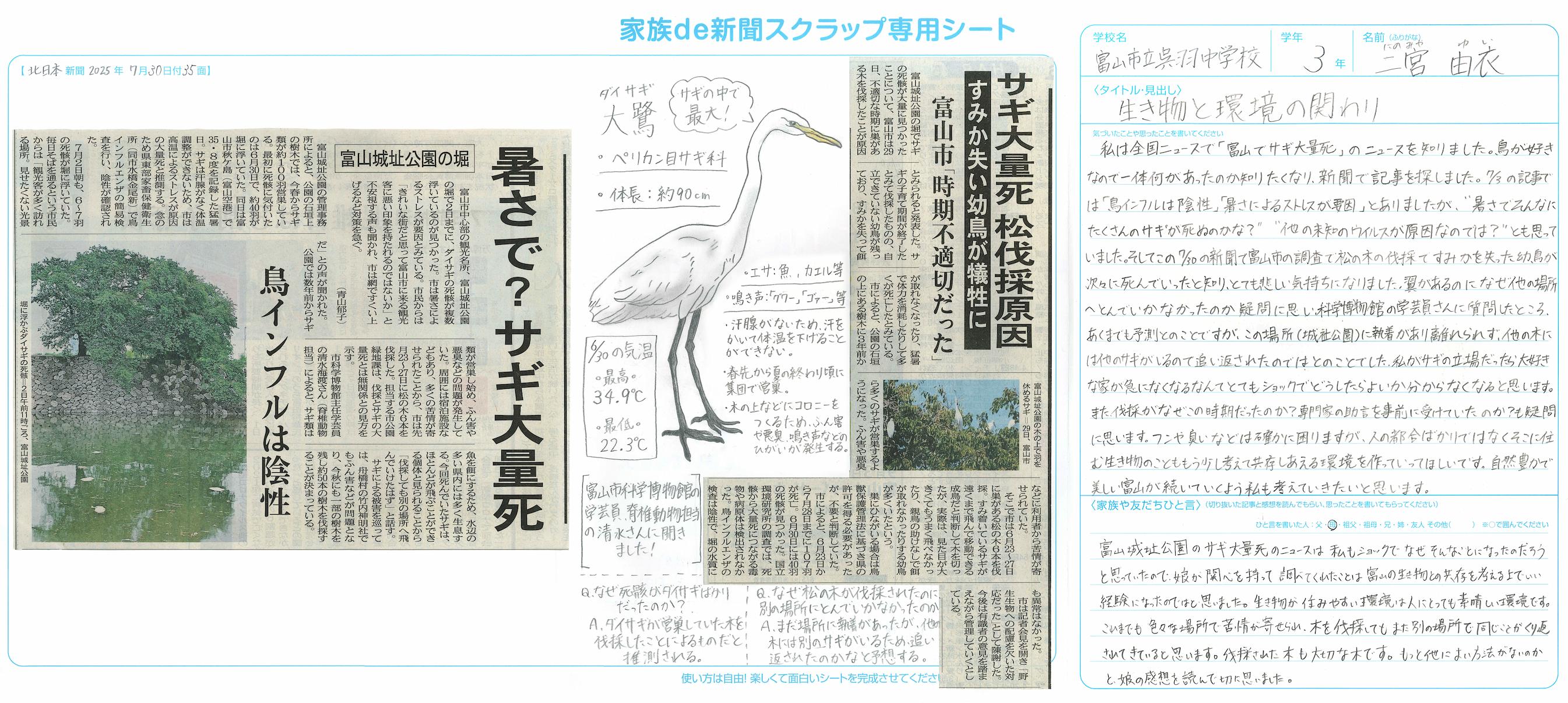 新聞の記事は知りたいことを知るだけでなく、自身の経験を反芻し、生き方を考え、自身が変わるきっかけとなることもあると思います。今後も新聞を通していろいろな世界に接し、傍観するのではなく、自分に働きかけ、自分の考えを発信してくれることを期待しています。