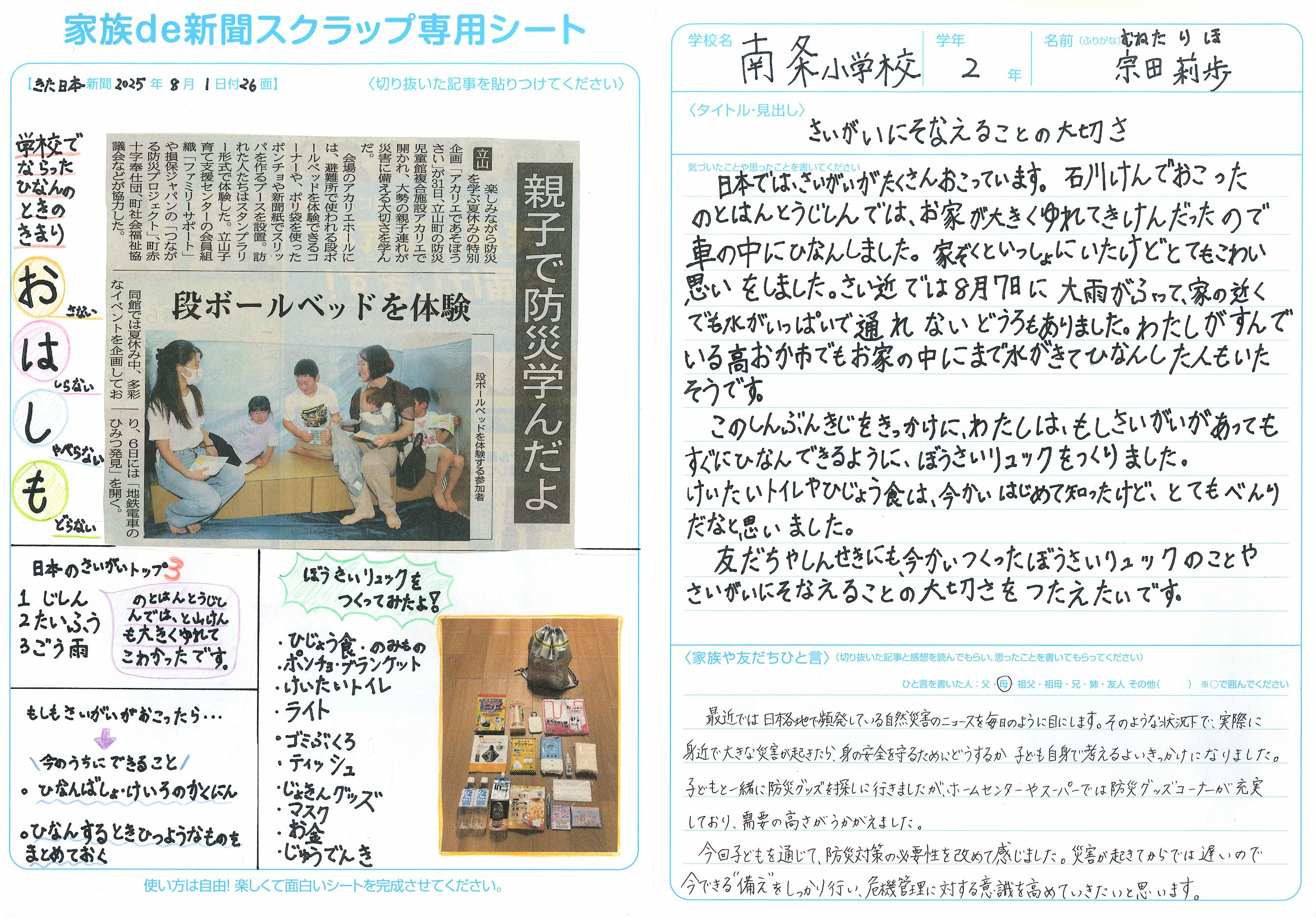 私は、能登半島地震を経験して、災害は遠い世界の話ではなく、自分のすぐそばにあることを知りました。そして、備えることの大切さ、柔軟に対応する力、そして人を思いやる気持ちが、災害に立ち向かうために必要だと感じました。これからも、家族や学校の人たちと一緒に、災害に備えていきたいです。